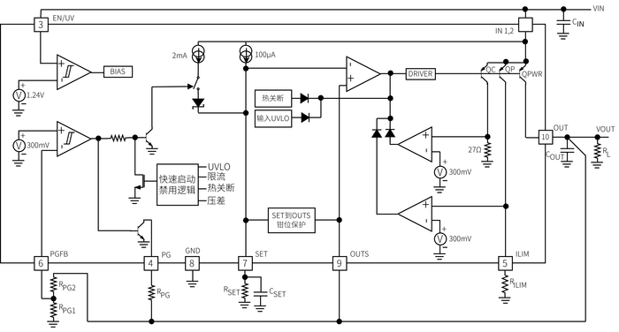 CM6111可在350mV典型压差下提供200mA输出电流。正常工作时静态电流典型值为2mA,关断模式下小于1μA。CM6111能够在1.7V~15V的宽输出电压范围内提供稳定而优异的性能,输出噪声、PSRR、带宽和负载调整率几乎不受输出电压的影响。此外,该稳压器还具有可编程电流限值、快速启动以及PG 指示等特性。